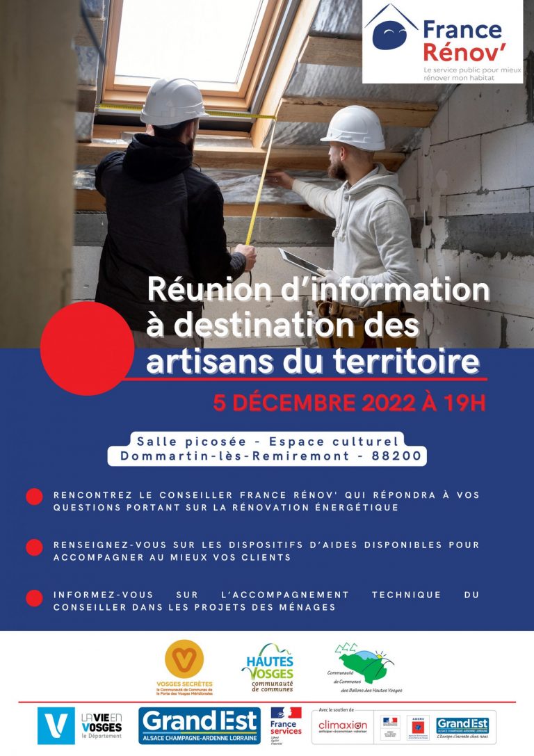 Les Communautés de Communes de la Porte des Vosges Méridionales, des Hautes Vosges et des Ballons des Hautes Vosges organisent une réunion de présentation du service France Rénov’ pour les artisans de la rénovation énergétique, et en présence du conseiller France Rénov’.
