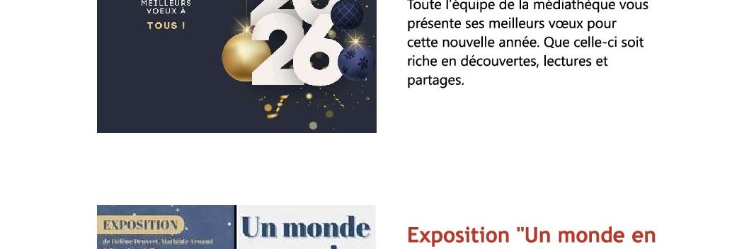 LETTRE D’INFORMATION : MÉDIATHÈQUE LE CERCLE JANVIER 2026CCPVM, MédiathèquePar Nicole Georges8 janvier 2026Jan82026 CCPVMMédiathèque Médiathèque portage à domicile Lettre d’information ici Read Article