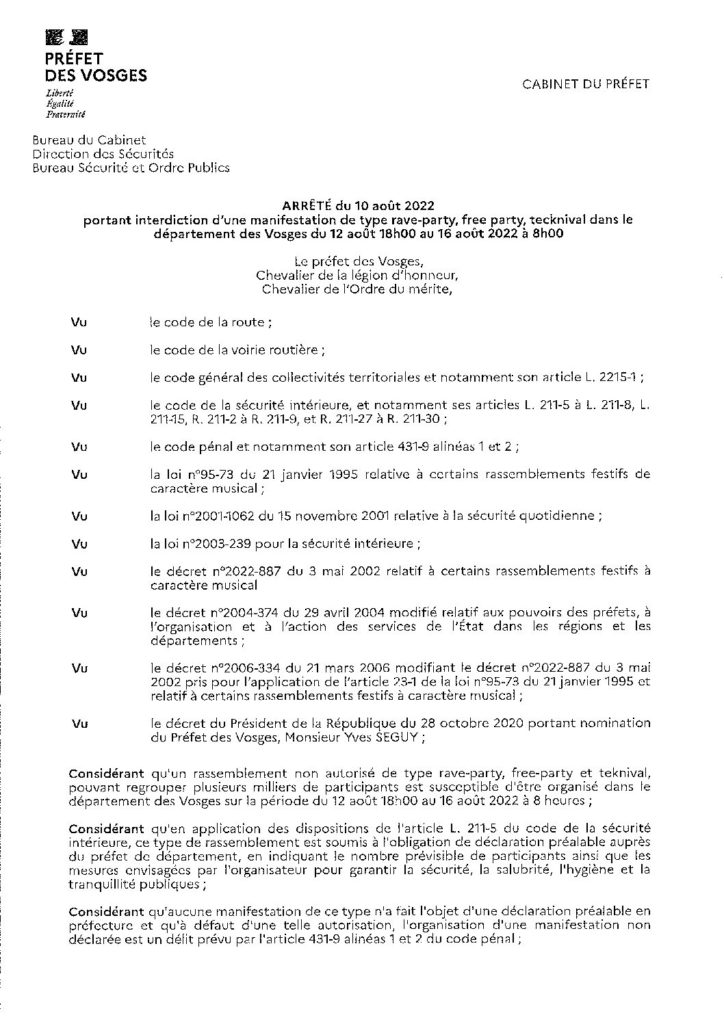 Arrêté portant interdiction d’une manifestation de type rave-party, free-party, tecknival dans le département des Vosges du 12 août 18h00 au 16 août 2022 08h00 inclus.