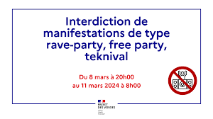 ARRÊTÉ PRÉFECTORAL PORTANT INTERDICTION D’UNE MANIFESTATION DE TYPE RAVE-PARTY, FREE-PARTY ET TEKNIVAL DANS LE DÉPARTEMENT DES VOSGES DU VENDREDI 08 MARS 2024 20H00 AU LUNDI 11 MARS 8H00