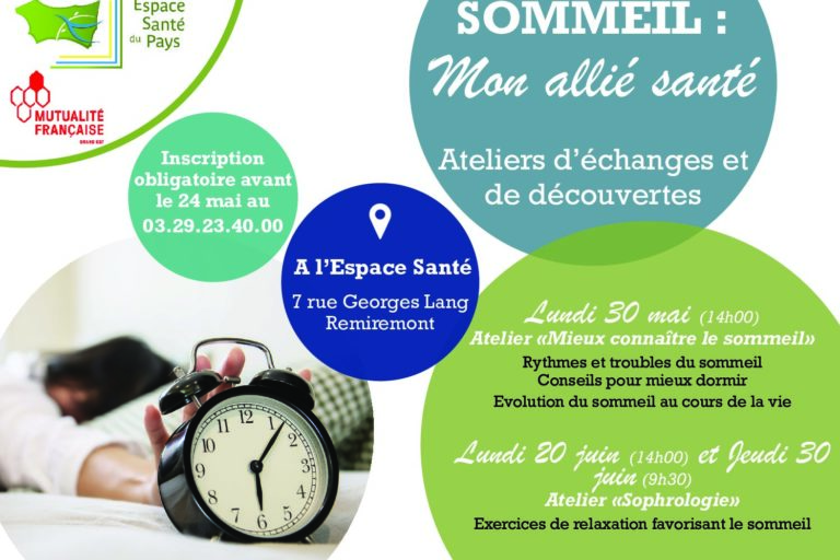 Une série de 3 ateliers « le sommeil, mon allié santé » se déroulera à l’Espace santé à Remiremont les 30 mai, 20 juin et 30 juin dans le but de renforcer les connaissances sur le sommeil et ses spécificités et améliorer la capacité des participants à mettre en place des techniques favorisant un bon sommeil.