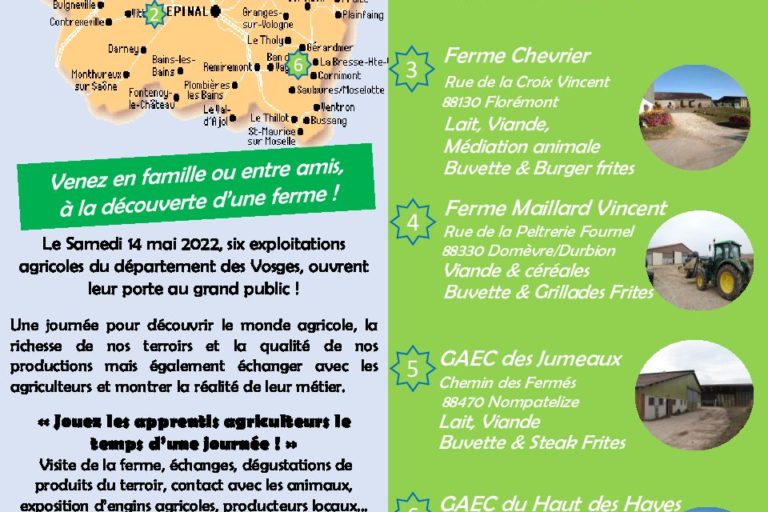 La FDSEA des Vosges et les Jeunes Agriculteurs Vosges organisent les 13 et 14 mai prochain, les « Rencontres à la Ferme », évènement national lors duquel six exploitations ouvriront leur ferme aux scolaires le vendredi et au grand public le samedi 14 mai 2022.