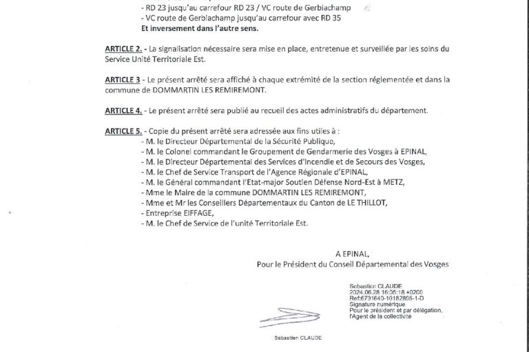 Dans la période du 10 au 12 juillet 2024 et pour une durée maximale de 0.5 jour, la circulation de tous les véhicules sera interdite sur la RD 35 entre les PR 1+525 et 1+860, sur le territoire de la commune de DOMMARTIN LES REMIREMONT. L’itinéraire de déviation empruntera les voies suivantes: Dans le sens…