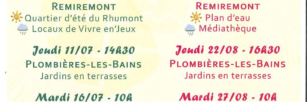 Cet été, venez écouter des histoires au soleil! La médiathèque vous donne rendez-vous pour ses lectures enfants. JUILLET : Mardi 09/07 – 10h00 Remiremont, quartier d’été du Rhumont si soleil, locaux de Vivre en Jeux si pluie Jeudi 11/07 – 14h30 Plombières -les-Bains, Jardins en terrasses Mardi 16/07- 10h00 Remiremont, Plan d’eau si soleil, Médiathèque…