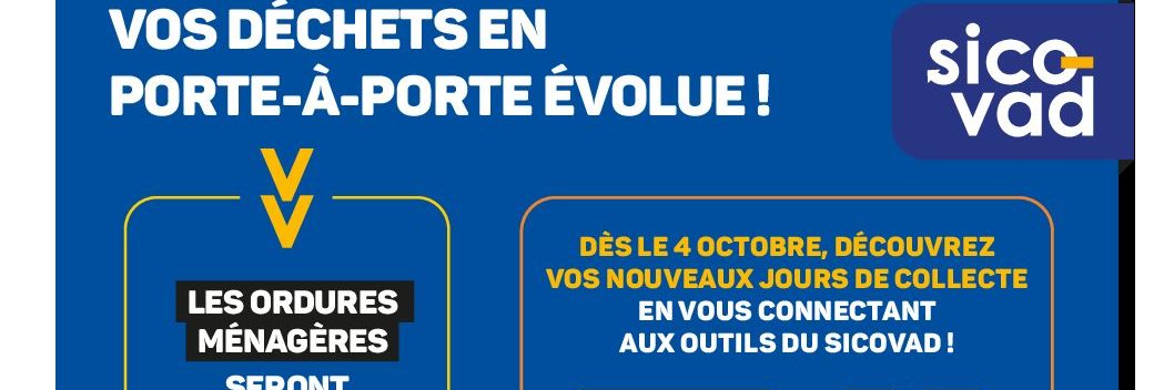Attention, à partir du vendredi 18 octobre pour notre commune, votre container sera collecté une semaine sur deux. Merci d’en prendre bonne note !! Toutes les infos dans le mag du SICOVAD Voici le tableau des collectes