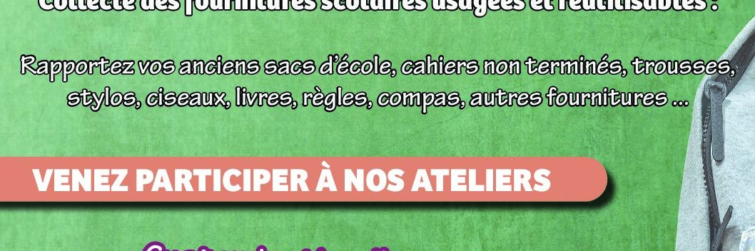 Rapportez vos anciens sacs d’école, cahiers non terminés, trousses, stylos, ciseaux, livres, règles, compas, autres fournitures …