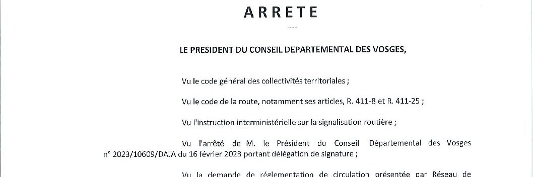 Cet arrêté est valable du 27 au 30 juin, la circulation de tous les véhicules sera interdite sur la RD 35A entre les PR 0 et 0+100 sur le territoire de la commune de Dommartin les Remiremont. Un itinéraire de déviation est prévu. Vous trouverez ci-dessous l’arrêté concerné: 20230627152050609