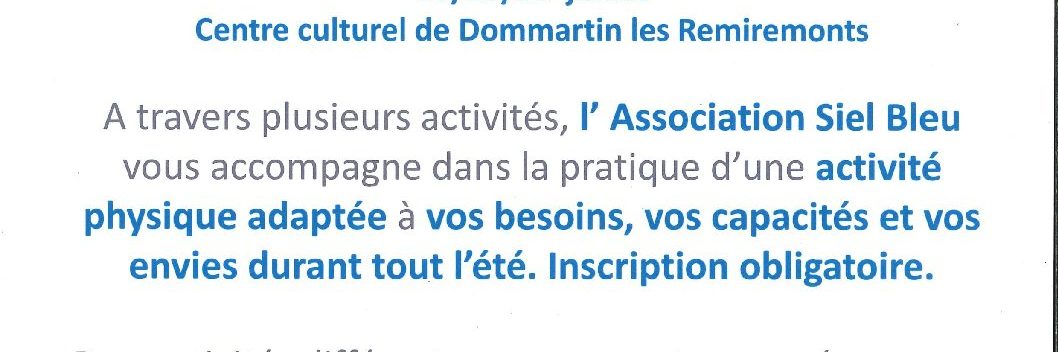 SANTÉ – SENIOR – ACTIVITÉ PHYSIQUE Les mercredis de 9h à 10h Les 16/23 et 30 Juillet A l’Espace Culturel de Dommartin-lès-Remiremont A travers plusieurs activités l’Association SIEL BLEU vous accompagne dans la pratique d’une activité. Différentes activités y seront proposées: Basket Tir à l’arc Boxe Escrime … Les séances sont gratuites. Merci de contacter…