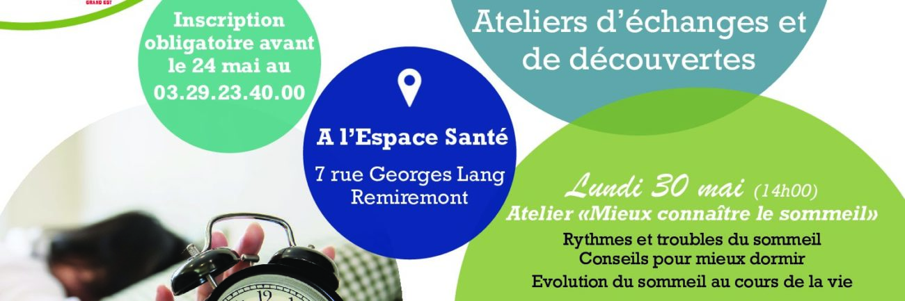 Une série de 3 ateliers « le sommeil, mon allié santé » se déroulera à l’Espace santé à Remiremont les 30 mai, 20 juin et 30 juin dans le but de renforcer les connaissances sur le sommeil et ses spécificités et améliorer la capacité des participants à mettre en place des techniques favorisant un bon sommeil.