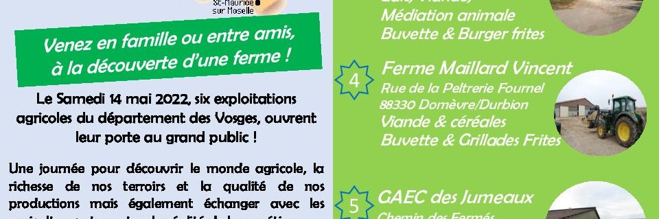 La FDSEA des Vosges et les Jeunes Agriculteurs Vosges organisent les 13 et 14 mai prochain, les « Rencontres à la Ferme », évènement national lors duquel six exploitations ouvriront leur ferme aux scolaires le vendredi et au grand public le samedi 14 mai 2022.