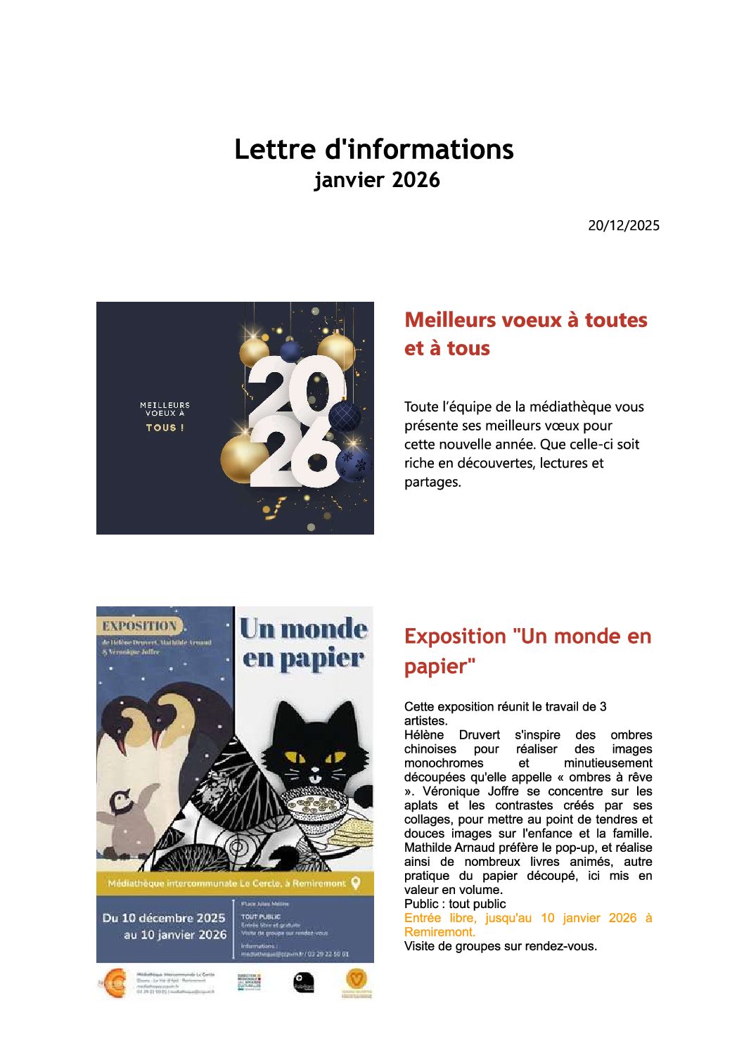 Jan82026CCPVMMédiathèqueMédiathèque portage à domicileLettre d’information ici Navigation de commentaireOnglet précédent Onglet précédent EAU ET ASSAINISSEMENT-QUI CONTACTER ?Plus d'actualités ?EAU ET ASSAINISSEMENT-QUI CONTACTER ?7 janvier 2026LA RÉGIE DES EAUX VOUS INFORME7 janvier 2026PRELEVEMENT AUTOMATIQUE POUR FACTURES EAU25 novembre 2025LETTRE D’INFORMATION : MÉDIATHÈQUE LE CERCLE OCTOBRE 20251 octobre 2025C’EST CE WEEK END : SPLASH £ PLOUF 3 JOURS EXCEPTIONNELS A LA LIGNE DE REMIREMONT12 août 2025LETTRE D’INFORMATION : MÉDIATHÈQUE LE CERCLE AOÛT 20251 août 2025
