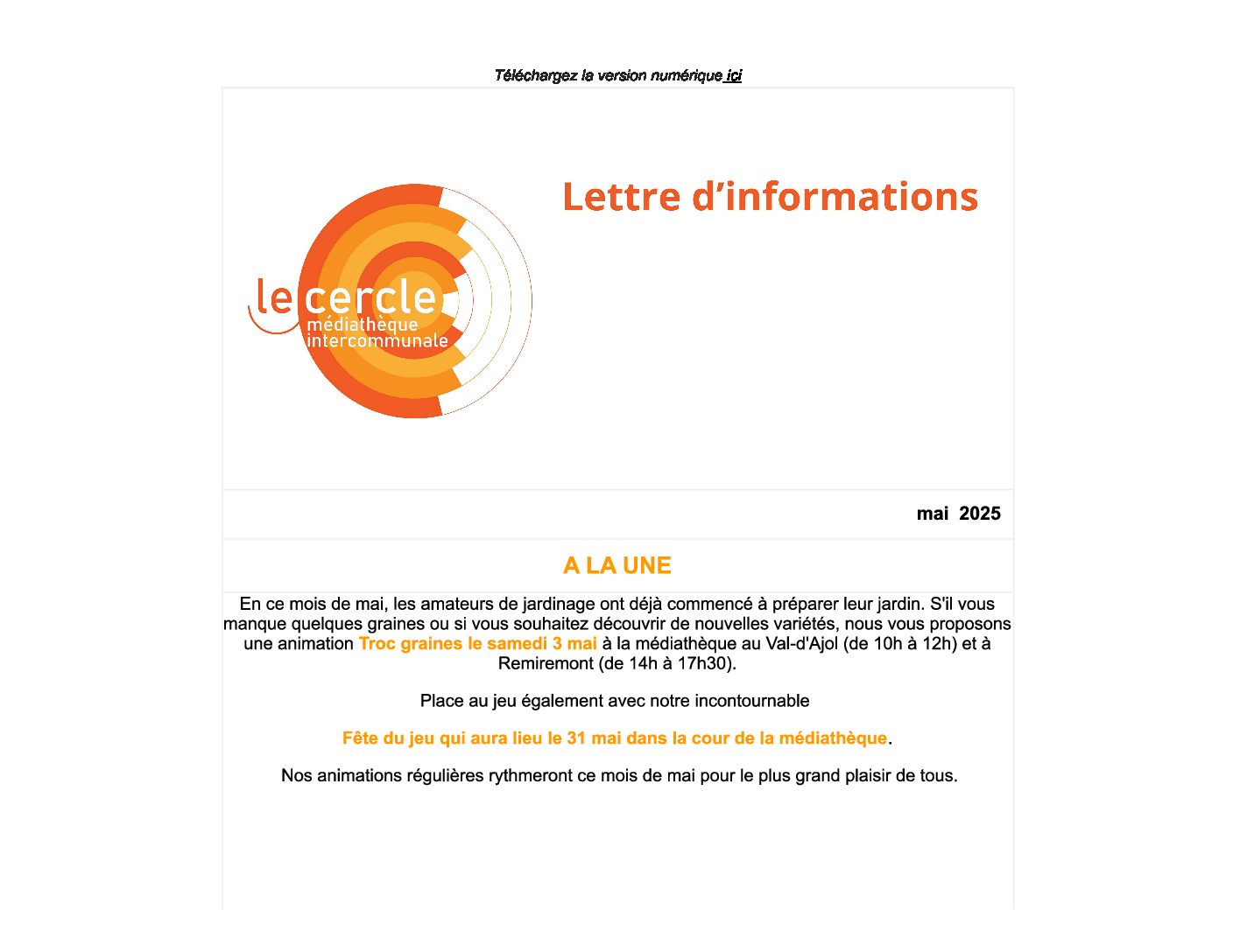 Avr302025CCPVMMédiathèqueMédiathèque portage à domicileLettre d’information ici Navigation de commentaireOnglet précédent Onglet précédent SURVOL DE LA COMMUNE EN HÉLICOPTÈRE POUR ENEDISOnglet suivantOnglet suivantCÉRÉMONIE DU 8 MAI AU MONUMENT AUX MORTSPlus d'actualités ?PRELEVEMENT AUTOMATIQUE POUR FACTURES EAU25 novembre 2025LETTRE D’INFORMATION : MÉDIATHÈQUE LE CERCLE OCTOBRE 20251 octobre 2025C’EST CE WEEK END : SPLASH £ PLOUF 3 JOURS EXCEPTIONNELS A LA LIGNE DE REMIREMONT12 août 2025LETTRE D’INFORMATION : MÉDIATHÈQUE LE CERCLE AOÛT 20251 août 2025LANCEMENT DE L’APPEL A PROJETS « BOUTIQUE »2 juillet 2025C’EST L’ÉTÉ !!!!2 juillet 2025