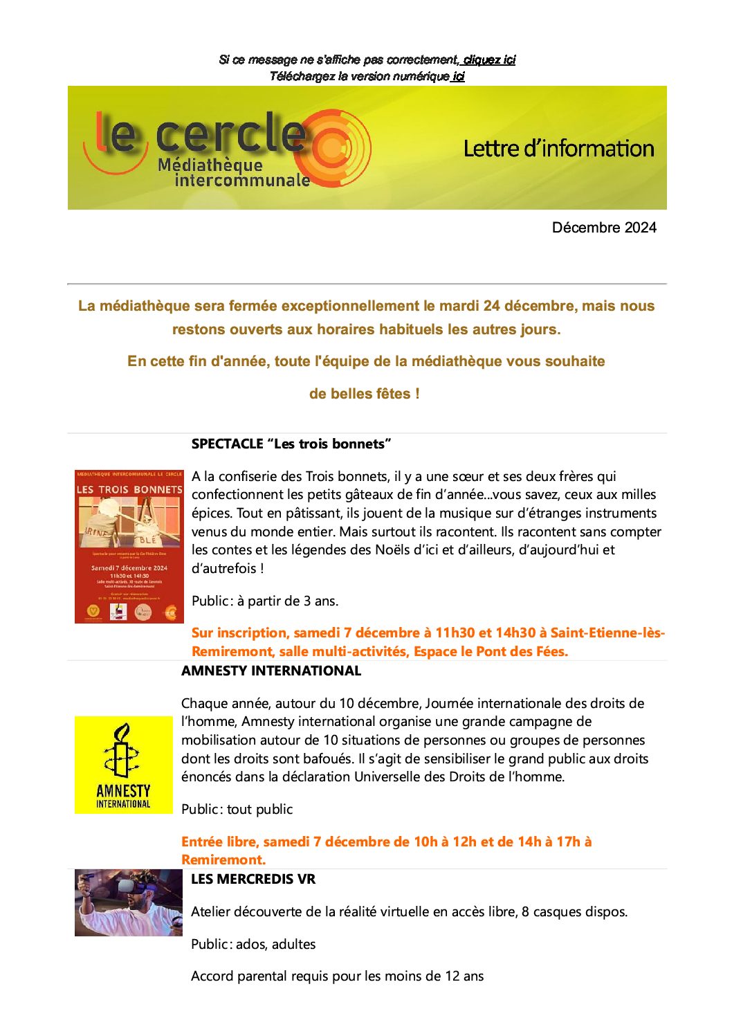 Déc42024CCPVMMédiathèqueLettre d’information ici Navigation de commentaireOnglet précédent Onglet précédent INFOS MAIRIE : GRÊVE ÉDUCATION NATIONALE LE JEUDI 05 DÉCEMBRE 2024Onglet suivantOnglet suivantLE SICOVAD VOUS INFORME… COLLECTE DES SAPINS DE NOËLPlus d'actualités ?PRELEVEMENT AUTOMATIQUE POUR FACTURES EAU25 novembre 2025LETTRE D’INFORMATION : MÉDIATHÈQUE LE CERCLE OCTOBRE 20251 octobre 2025C’EST CE WEEK END : SPLASH £ PLOUF 3 JOURS EXCEPTIONNELS A LA LIGNE DE REMIREMONT12 août 2025LETTRE D’INFORMATION : MÉDIATHÈQUE LE CERCLE AOÛT 20251 août 2025LANCEMENT DE L’APPEL A PROJETS « BOUTIQUE »2 juillet 2025C’EST L’ÉTÉ !!!!2 juillet 2025