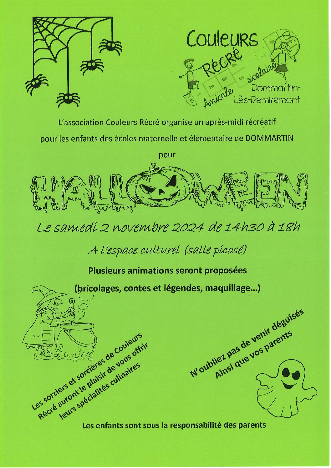 L’Amicale Scolaire Couleurs Récré organise un après midi récréatif pour les enfants des écoles maternelle et élémentaire de DOMMARTIN le 2 novembre de 14h30 à 18h à l’Espace Culturel de Dommartin-lès-Remiremont ! Au programme : bricolage, boum, maquillage.