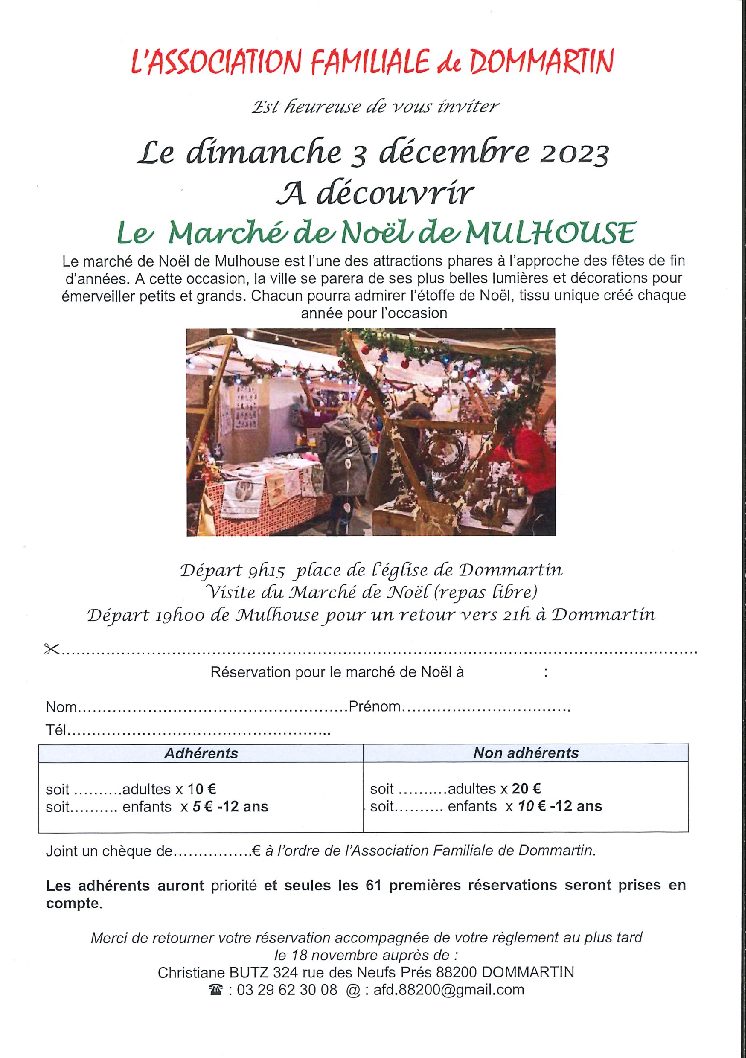 L’association Familiale de Dommartin les Remiremont propose une sortie à la journée au marché de Noël de Mulhouse le dimanche 3 décembre, dans le cadre des fêtes de Noël. Le départ se tiendra sur la place de l’Eglise à 9h15 et le retour se fera vers 21h à Dommartin.