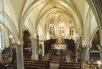 construction des voûtes ogivales de la nef et des bas-côtés en lieu et place des voûtes en bois et lambris ; fermeture des deux portes latérales situées de part et d’autre de la porte d’entrée principale ; mise en place, sur l’ensemble de l’édifice, d’une couverture en ardoises à la place des bardeaux de bois qui avaient jusqu’alors servi à couvrir le bâtiment ; régularisation des fenêtres des bas-côtés et mise en place des vitraux actuels, ainsi que de ceux du chœur.